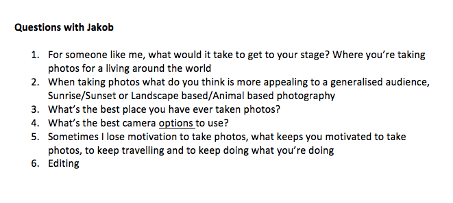Since the pitch I have furthermore gained information and expertise from a professional photographer – Jakob De Zwart. I was luckily allowed to interview him in an act to gain knowledge regarding camera skills and how to improve my account overall. Overall, the interview allowed me to realise what I must improve to build my DA into a successful account.