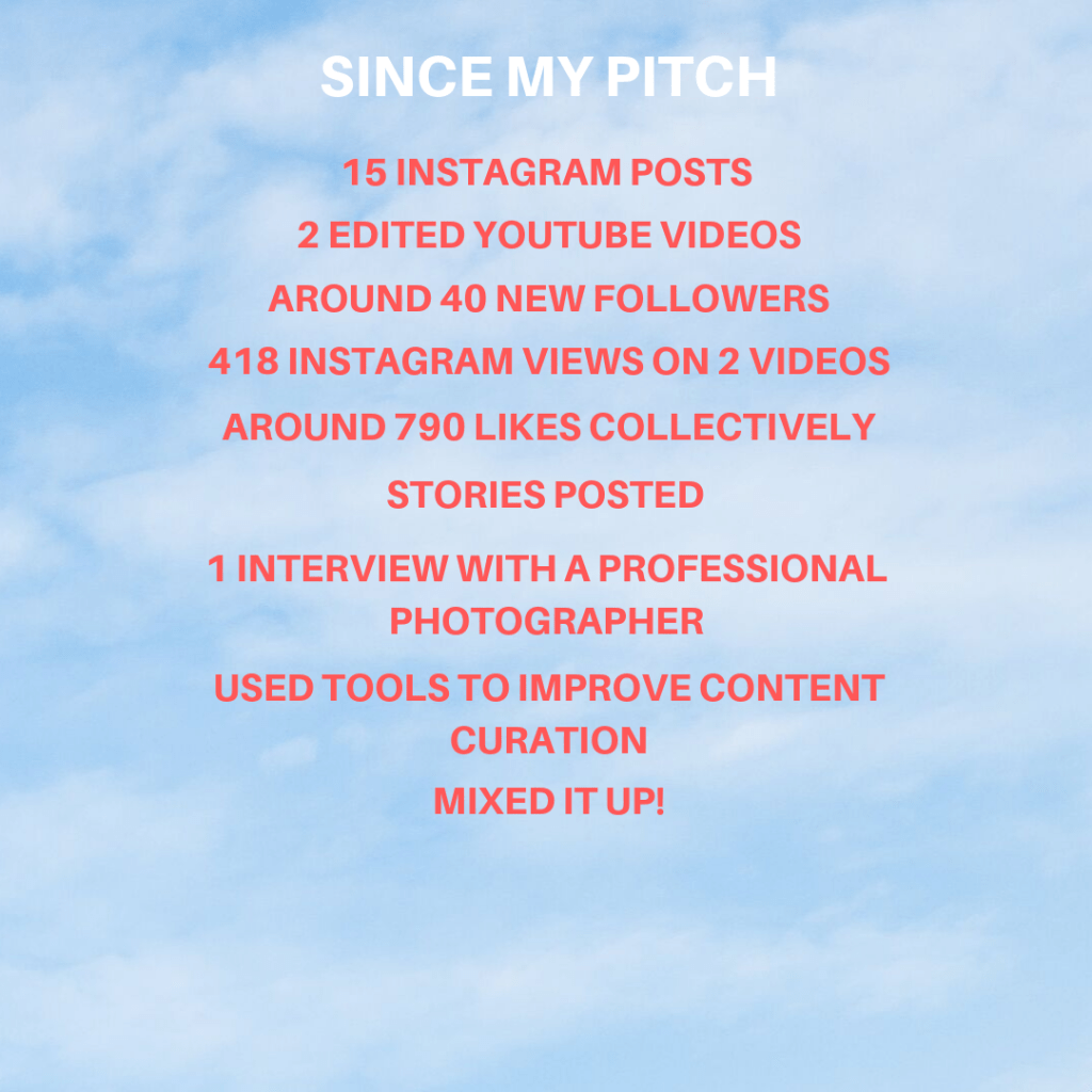 Since my pitch I have aimed to maintain consistent production of content with heavily photography-based content fused together with two videos made as well.