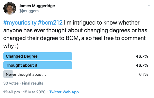 My poll was made in particular for people who have changed degrees to a media and communications degree. Yet, as I’m specifically aiming towards the emotional reasoning as to why students change degrees, defer or drop out, I will draw research through comments by fellow peers of the BCM degree.