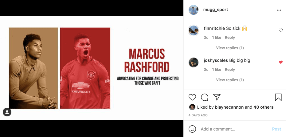 My name is James Muggeridge and for BCM302 this semester I will be starting a fresh project called ‘Mugg Sport’. Mugg Sport is a personal portfolio platform where I will share sports articles trying to raise awareness and promote the positive contributions which athletes are having off the field. My project content is currently displayed on my on personal website and is promoted on my Instagram page. Looking into the future, I definitely see potential to expand to other social media platforms.