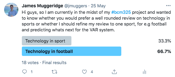 Audience engagement on Twitter assisted is redefining my project. Asking as to whether I should provide a whole view of technology in sport or a niche view of technology football, allowed me to alter my project overall.