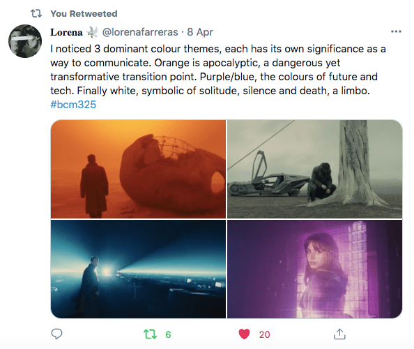 A post which was personally intriguing was Lorena’s post on the idea of using three dominant colours to set moods and scenes. Each colour described their own scene and thus allows the audience to feel emotionally connected through colour.