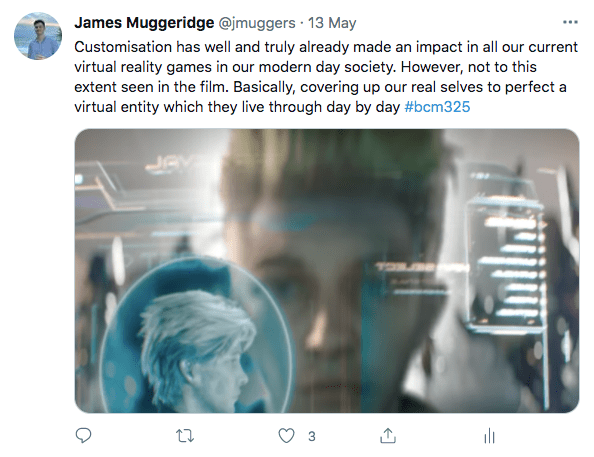 Continuing on from my last live tweeting summary, I have tried to be consistent with my tweets relating them to future media and lecture readings. I have also continued to share content by peers which I believed to be core to future media studies and which have appealed to myself personally. Part two of my live tweeting summary blog will incorporate my tweets on some of the most prolific sci-fi films in film history such as ‘The Matrix’ and ‘Blade Runner’. A movie which I personally enjoyed tweeting about was Ready Player One. A visually appealing movie which predicts a future that we are working towards. A society which uses virtual reality to cover their own imperfections as seen in popular customisation games such as GTA and Skyrim.