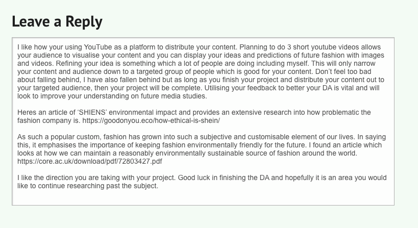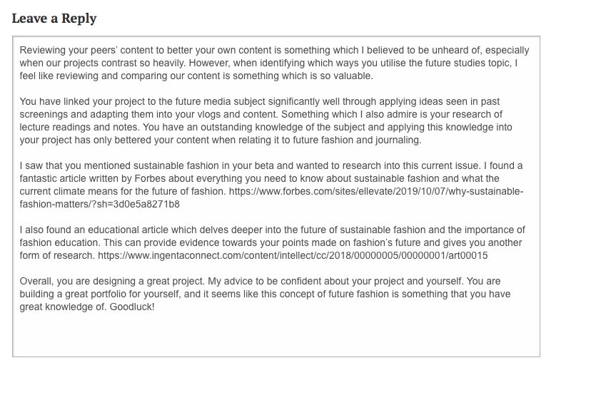 In concluding Lia’s project, I want to emphasise her outstanding knowledge of fashion and the future media study. Her project seems to be well thought out with a clear plan in place and clear view of the future of her project.